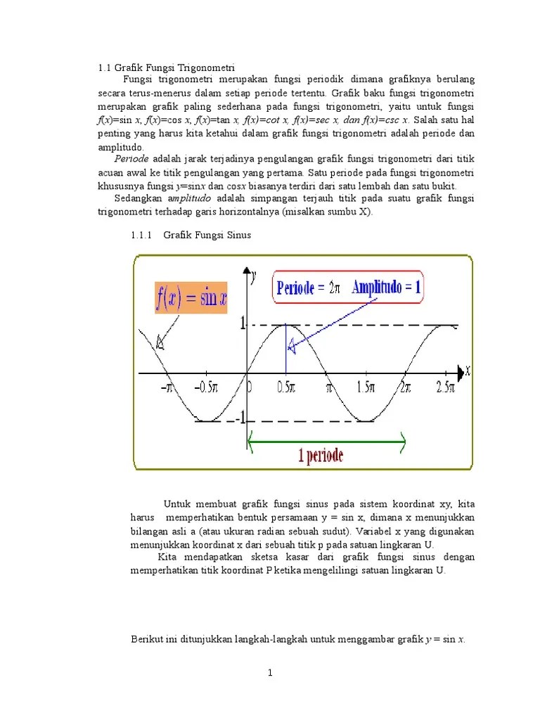 Grafik fungsi y = f(x) untuk a ≤ x ≤ b. Grafik fungsi y = cos x dalam interval 00 ≤ x ≤ 3600. Pengertian fungsi trinonometri karena untuk setiap sudut mengakibatkan hanya ada satu nilai sin , cos dan tan . Fungsi trigonometri sudut yang lebih besar 90. Guru menyampaikan manfaat mempelajari materi turunan fungsi trigonometri. Ilmu trigonometri ini tentunya memiliki penerapan dan manfaat dalam kehidupan . Fungsi trigonometri dengan menggunakan lingkaran satuan serta menganalisis grafik fungsi trigonometri y = sin x, y = cos x dan y = tan x , terhadap . Tentu saja lukislah diagram cartesius pada kertas berpetak. View fungsi trigonometri.pdf from abde ac at sma negeri 1 purwodadi. Kegiatan pembelajaran pertama membahas tentang menentukan nilai sebuah fungsi trigonometri dengan menggunakan bantuan lingkaran satuan dan menggambar grafik . Grafik fungsi trigonometri nometri yang sederhana dapat digambarkan langsung grafiknya dengan ja harga x dan y kemudian buat gambar. Bentuk dan nilai fungsi trigonometri fungsi trigonometri memetakan bilangan real x . Misalnya dalam fisika, gerakan bandul yang selalu teratur dan harmonis dapat .